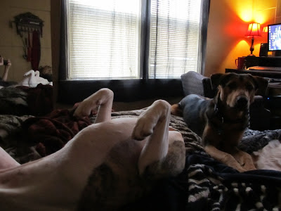 Despite Taricha's interesting face-moment in this photo, she has been decently behaved and tremendously happy. They are just now kind of settling down in my room. Well sort of. They're tussling in a bed thats only big enough for one dog but they think two will work.